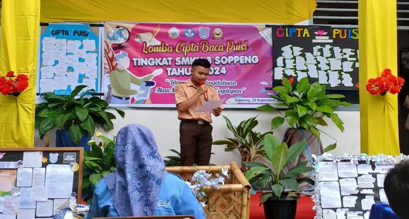 Kepala SMKN 3 Soppeng menjelaskan bahwa puisi adalah karya sastra yang merefleksikan perasaan penyair, terikat pada matra, irama, dan makna. Ia bangga atas pencapaian siswa yang berani menulis, berkat bimbingan guru Bahasa Indonesia. Ia berharap kegiatan ini menjadi agenda rutin untuk peningkatan literasi di sekolah.