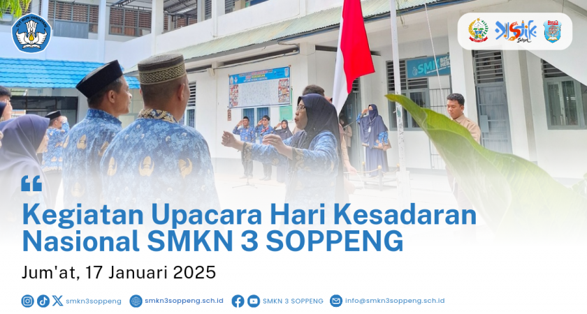 SMKN 3 Soppeng melaksanakan upacara Hari Kesadaran Nasional (HKN) pada Jumat pagi dengan penuh khidmat. Kegiatan yang diadakan di lapangan sekolah ini diikuti oleh seluruh siswa, guru, dan staf tata usaha.