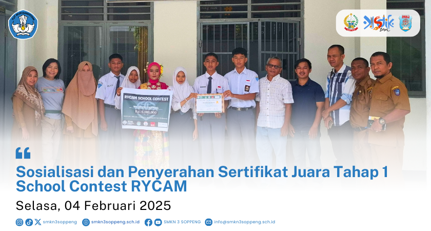 Kegiatan sosialisasi dihadiri Tim dari Yayasan Matepe Sulawesi Selatan membahas implementasi proposal Juara SMKN 3 Soppeng pada School Contest RYCAM Tahap 1 yang bertajuk "Mengurangi Emisi Melalui School Mini Forest". Acara yang digelar di Aula SMKN 3 Soppeng ini dihadiri oleh anggota tim pemenang, Yayasan Matepe Sulawesi Selatan sebagai fasilitator, serta seluruh civitas akademika SMKN 3 Soppeng.